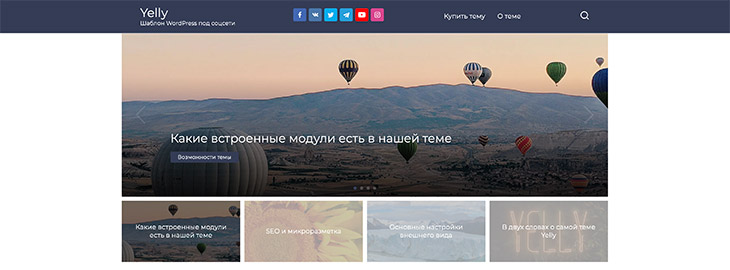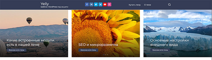В шаблон Yelly встроен слайдер для главной страницы. Активировать его можно в кастомайзере Внешний вид > Настроить в разделе Модули.